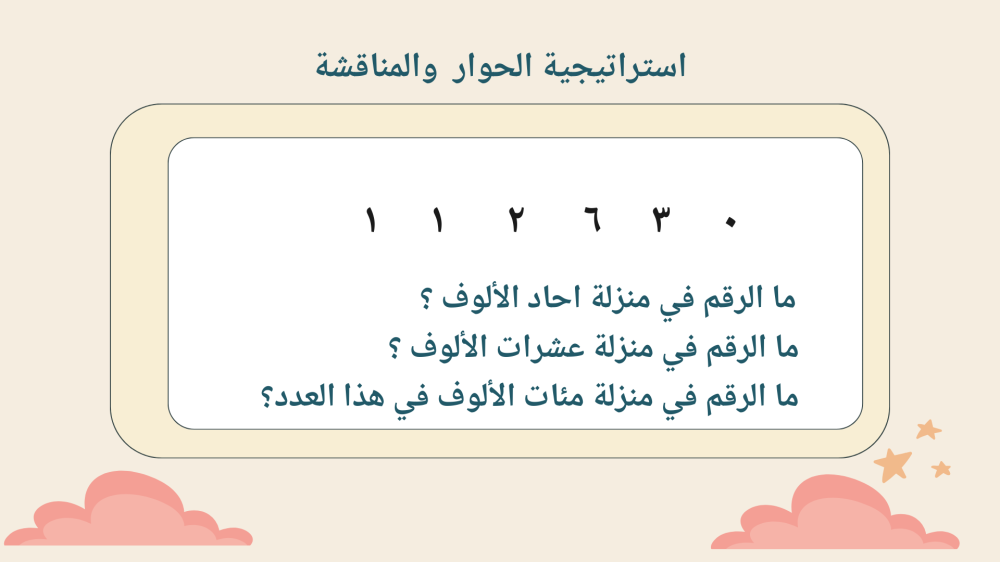 تُقدم الأنشطة التفاعلية أيضًا تمارين ممتعة، مثل ترتيب الأرقام الكبيرة في تسلسل تصاعدي أو تنازلي، أو تقسيم الطلاب إلى فرق للعمل على حل مشكلات حقيقية تتضمن الأعداد ضمن مئات الألوف.
