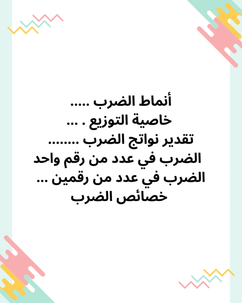 حقيبة تعليمية مصممة بعناية لتغطية جميع دروس الضرب في الجزء الأول من الفصل الثالث للصف الخامس الابتدائي، وتشمل العروض المفاهيم الأساسية في الضرب بأسلوب تفاعلي ومبسط، مناسب للعرض على السبورة الذكية.