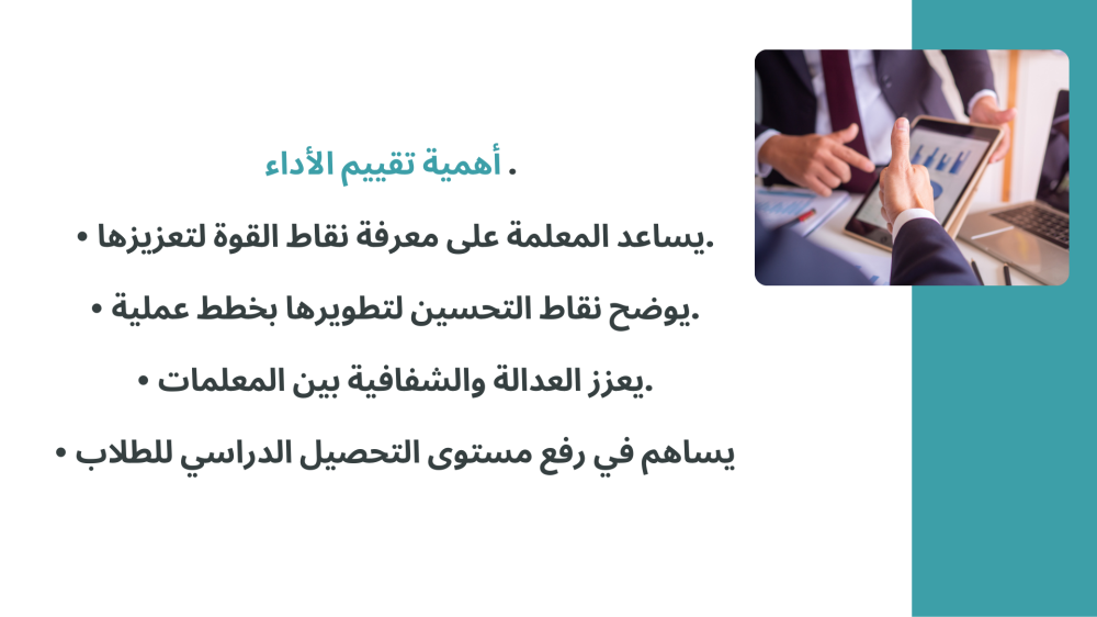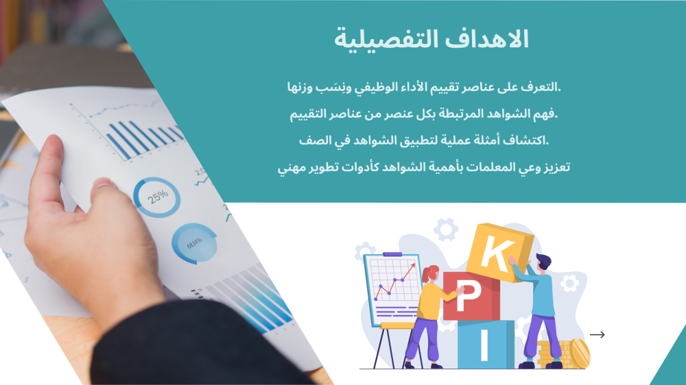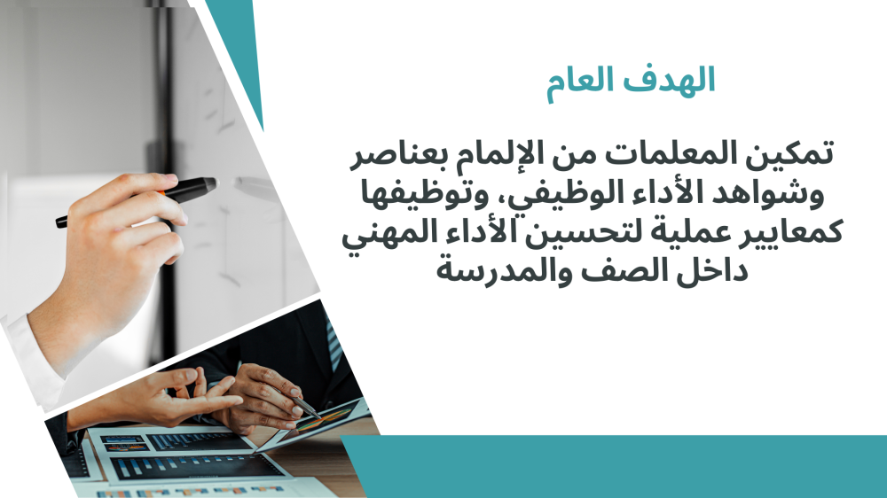 ملف رقمي تفاعلي يساعد المعلمات على فهم عناصر تقييم الأداء الوظيفي وشواهده، مع أنشطة تطبيقية وأمثلة عملية يمكن تنفيذها داخل المدرسة.